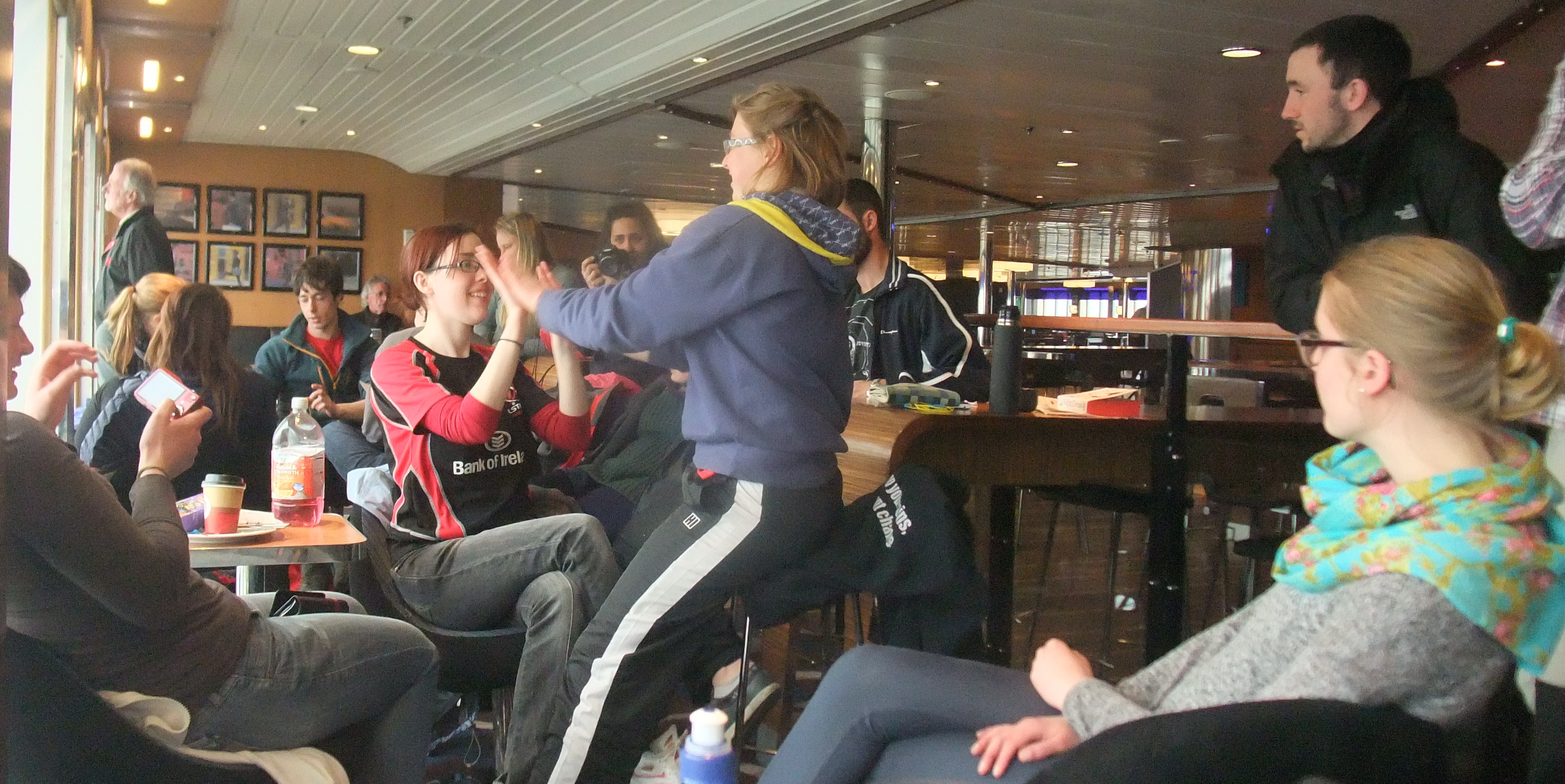 Arrivée à Holyhead pour embraquer dans le ferry. Dans la salle d’attente c’était dément, il y avait un Jenga géant, Puissance 4, babyfoot ! De vrais gamins qui tuent le temps.
