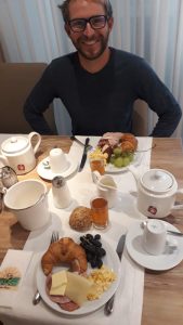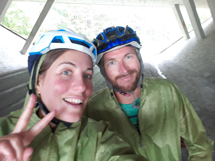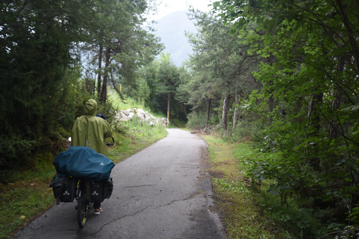 Le lendemain, nous roulons en direction d’Innsbruck, ville où nous savons qu’il y a une clinique pour les urgences dentaires. Mais celle-ci se trouve encore à 90 km, nous n’y seront pas ce soir là, qu’importe ! Nous roulons le plus possible pour y être tôt le lendemain. La pluie nous rattrapa en milieu de journée, décidément cette pluie ne nous lâche pas ! Un petit « I am singing in THE RAIN !! » chanté à pleine voix et bien-sûr avec un bel accent français en roulant sous la pluie battante, nous fait rire et nous redonne un peu de vigueur. Mais au bout de 5 heures de vélo, c’en est trop ! Nous sommes fatigué de cette pluie, des douleurs de dents, d’avoir nos affaires trempées, « je n’en peux plus ! Ce soir nous dormirons sous un vrai toit ! » dit Estelle, sur un ton non négociable, et Matthieu est amplement d’accord, les deux cyclistes ont besoin de confort. Ce soir là Mesdames et Messieurs, ce sera donc hôtel 4*, chambre double, salle de bain privée, goulach et wiener schnitzel au repas, et petit déjeuner de compétition. On vous laisse imaginer le bonheur! Nous nous sommes vite mis à l’aise avec la tente et les affaires étendues un peu partout dans la pièce. Le lendemain, les affaires sont sèches, nous sommes frais comme des gardons pour finir le trajet jusqu’à Innsbruck, même si la pluie qui tombe toujours nous fait sortir de l’hôtel à reculons.