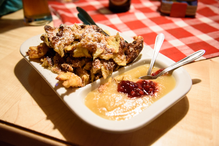 Kaiserschmarren : Sorte de pâte à crêpe mais dont les blancs sont montés en neige, frite au beurre à la poêle, avec du sucre et servie avec une compote de pomme.