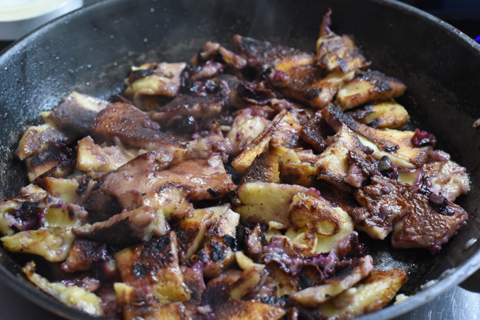 Retourner la galette et couper en morceaux grossier en rajoutant du beurre et du sucre pour bien faire griller.